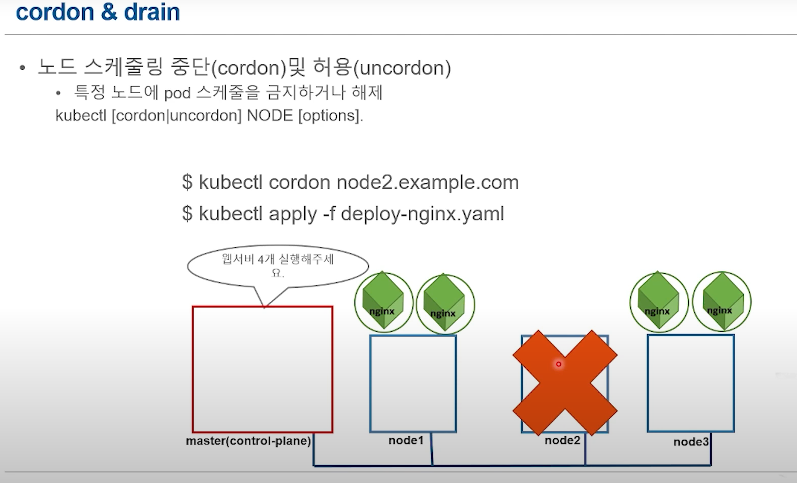 cordon은 노드의 스케줄링을 중단시키고 uncordon은 허용시킨다.