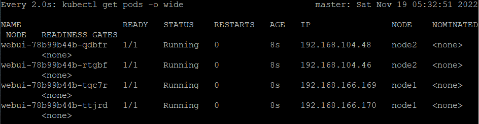 먼저 kubectl apply -f deploy-nginx.yaml을 통해 웹서버를 노드1, 노드2에 고르게 실행시키고
