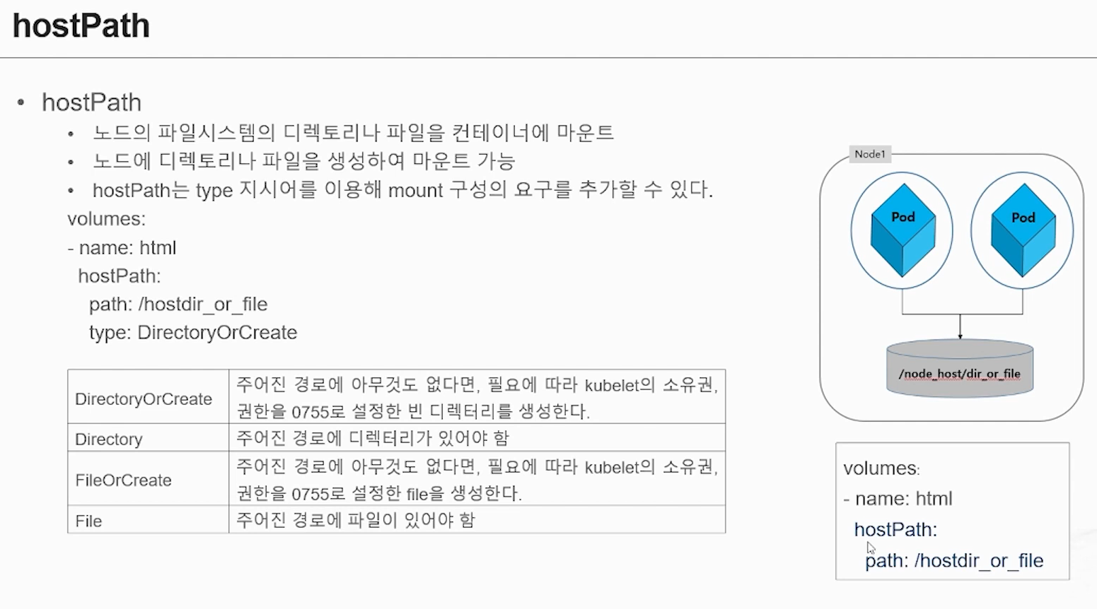 DirectoryOrCreate: 주어진 경로가 없다면 빈 디렉토리를 새로 생성한다.