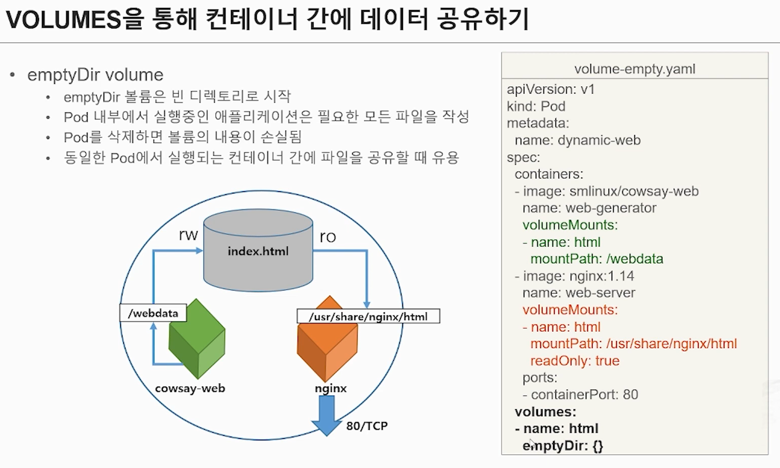 containers에 volumeMounts는 html이라는 볼륨에
