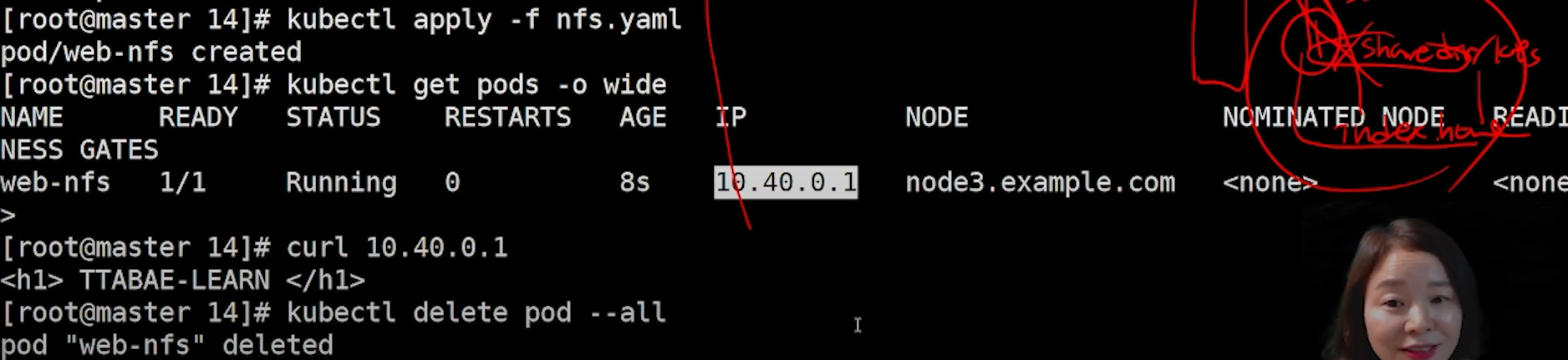 kubectl apply -f nfs.yaml로 실행해보면 노드3에서 실행중이고 curl로 접속하면 shared storage에 있는 index.html 파일의 내용인 TTABAE-LEARN이 출력된다.