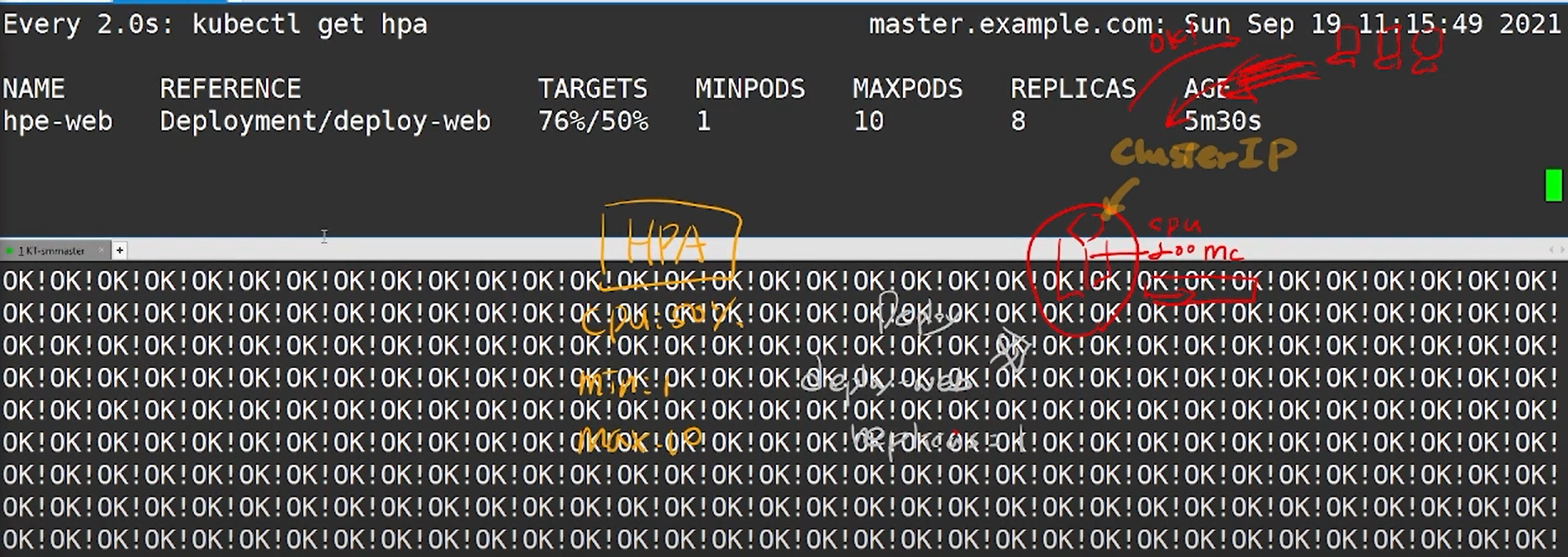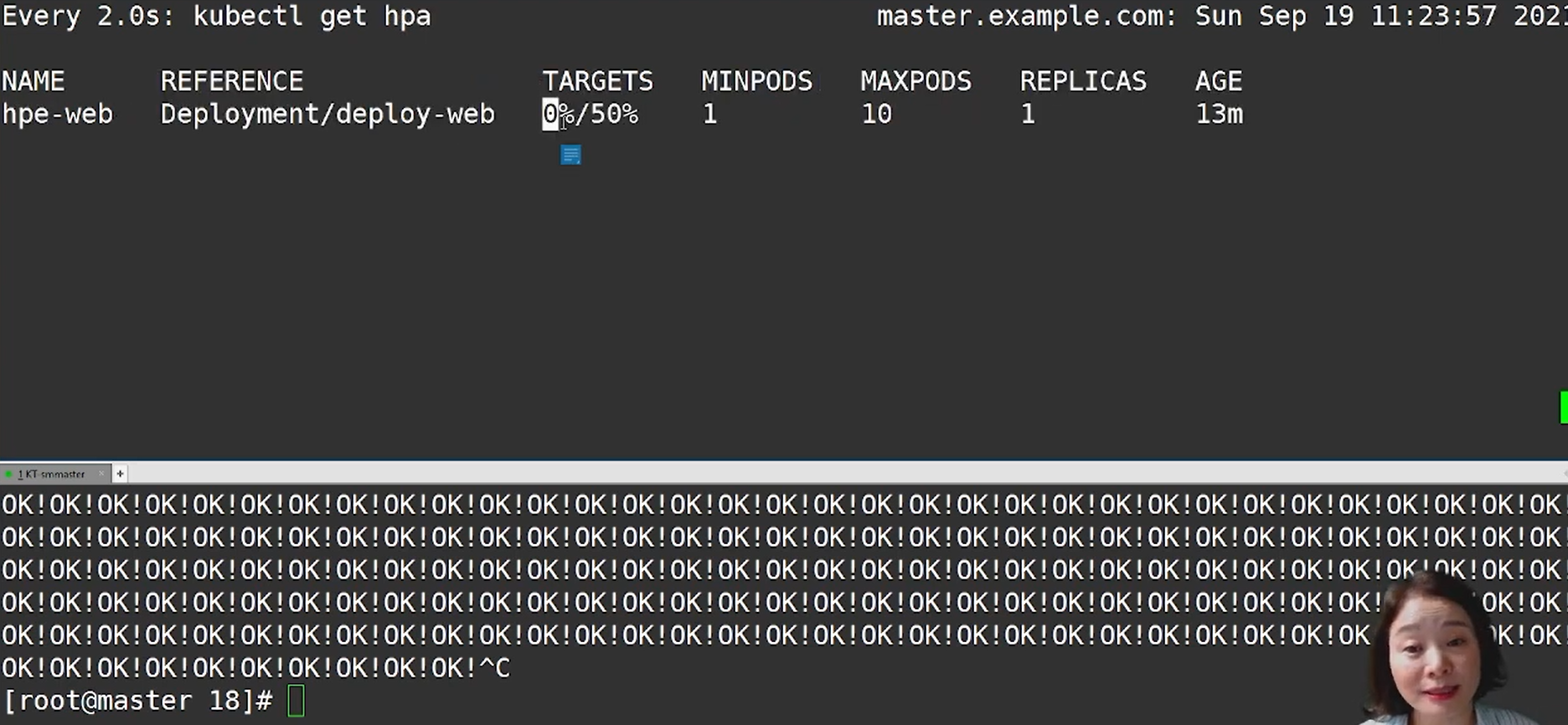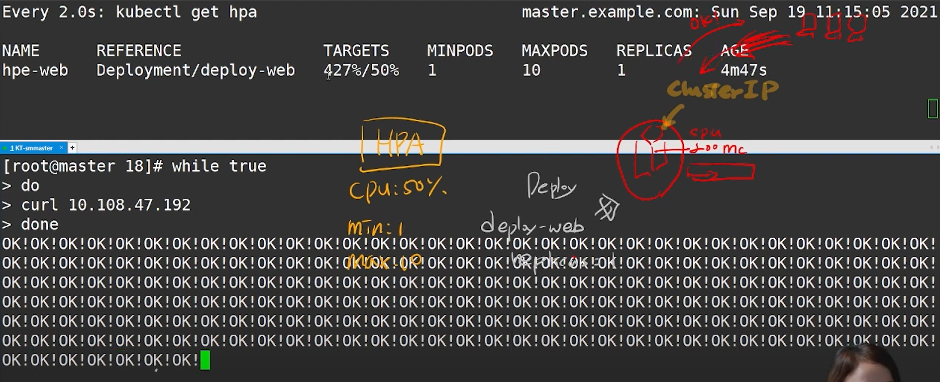 을 입력한다. 그럼 targets의 cpu 사용량 %가 올라서 replicas 개수가 늘어나는걸 볼 수 있다.