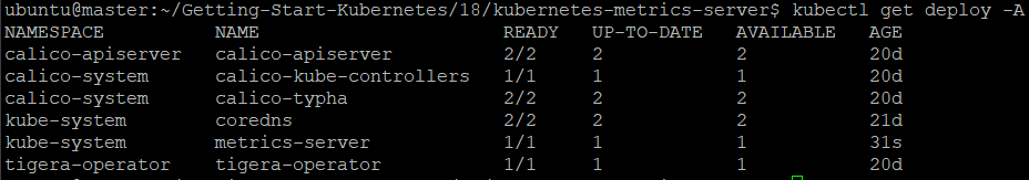 kubectl get deploy -A 로 확인하면 metrics-server가 실행중이다.