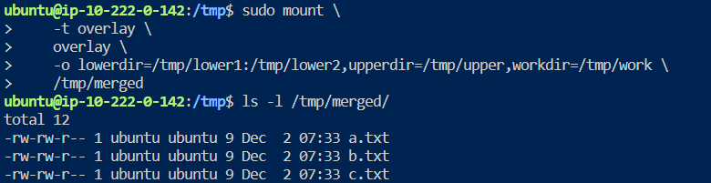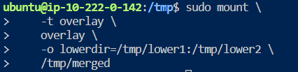 -o lowerdir=/tmp/lower1:/tmp/lower2,upperdir=/tmp/upper,workdir=/tmp/work \