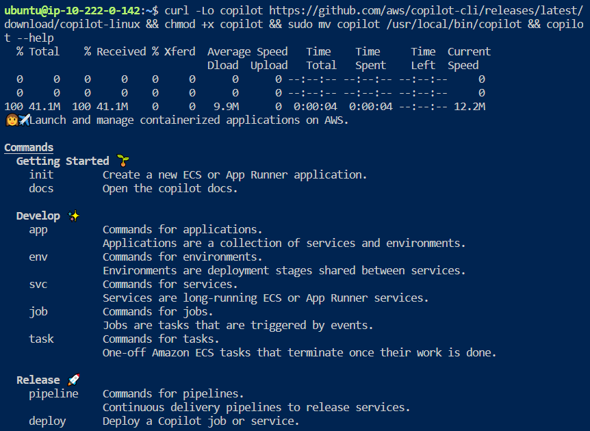curl -Lo copilot https://github.com/aws/copilot-cli/releases/latest/download/copilot-linux && chmod +x copilot && sudo mv copilot /usr/local/bin/copilot && copilot --help 명령어 입력