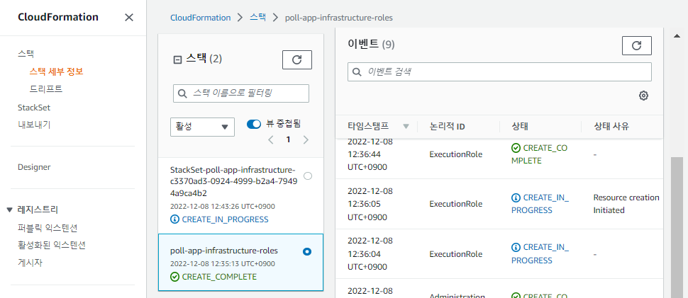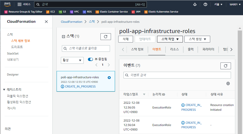 + 3분 이상 시간 소요 --> AWS Web Console에서 인프라 생성 내용 확인 (ECS, CloudFormation 등)