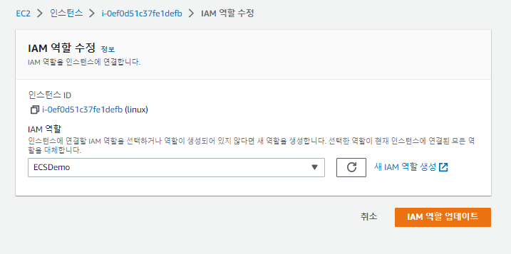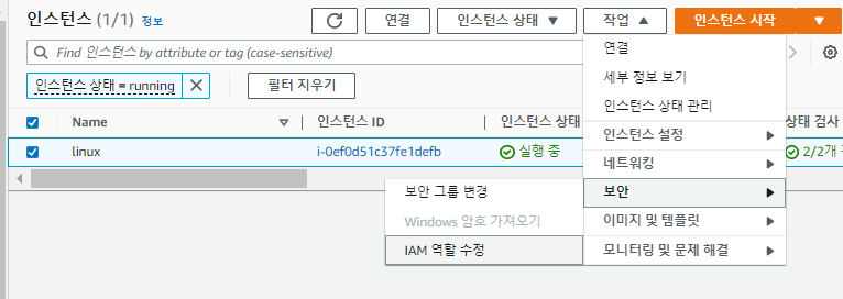 동작중인 ec2 인스턴스의 IAM 역할 수정을 한다.