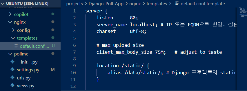 alias /data/static/; # Django 프로젝트의 static 파일 위치. 실습에서는 Dockerfile에서 지정.