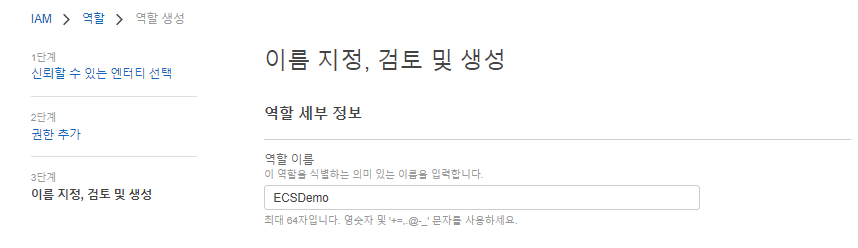 역할 이름을 ECSDemo로 설정하고 역할을 생성한다.