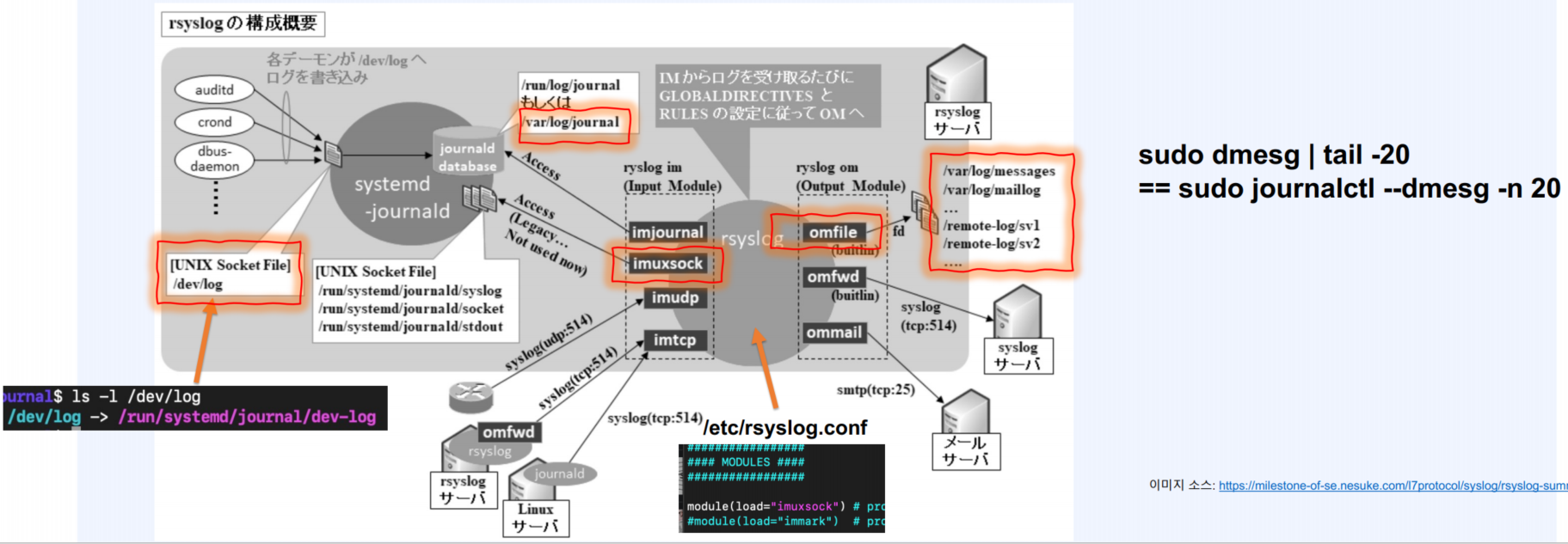 이벤트/메시지 -> /dev/log -> systemd-journald -> journalctl & rsyslogd -> 로그 파일