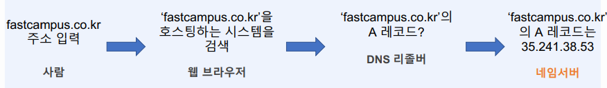 쿼리를 만들어 네임서버에 요청 -> 네임 서버는 A 레코드를 반환 -> 브라우저는 IP 주소를 통해 타겟 호스트에 TCP