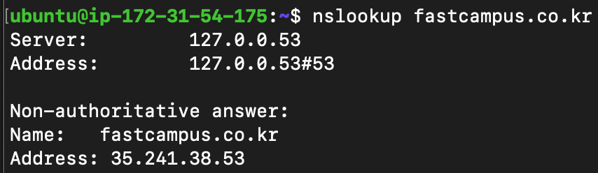 - 형식: [name] [ttl] [class] type data (예, fastcampus.co.kr. 103 IN A 35.241.38.53 )