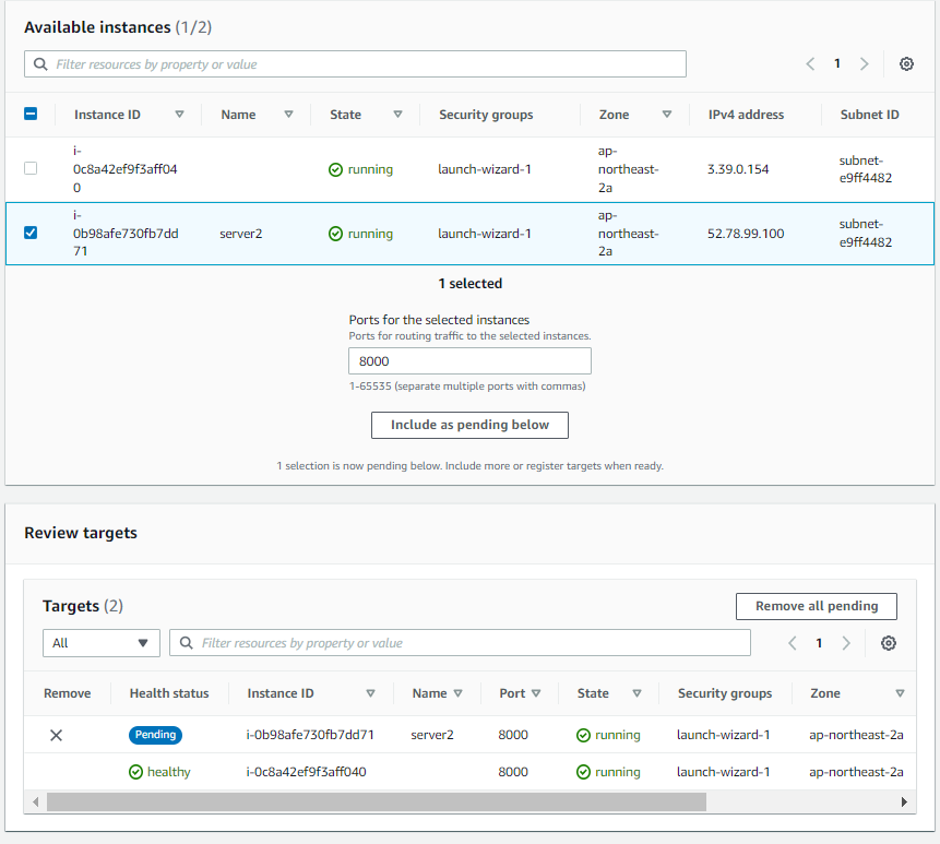 만든 대상그룹의 8000포트에 대해 Include as pending below 버튼을 누르고 Create target group버튼을 누르자