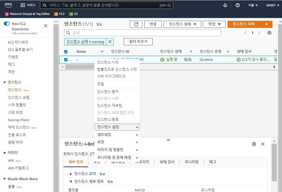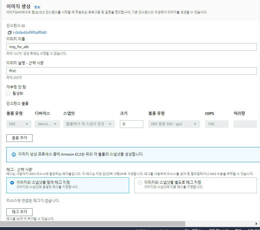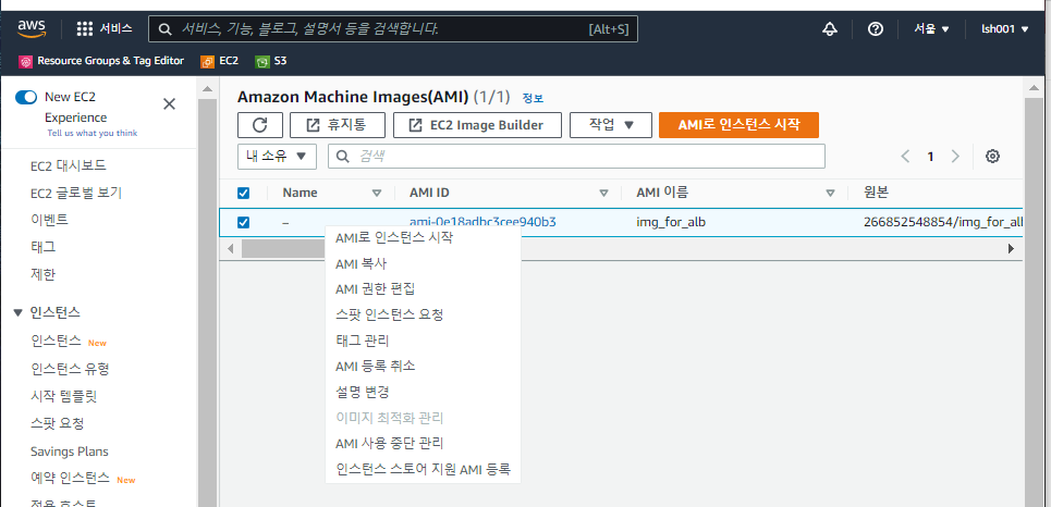 만들어논 ec2에서 이미지 및 템플릿 메뉴에서 이미지 생성에 들어간다.
