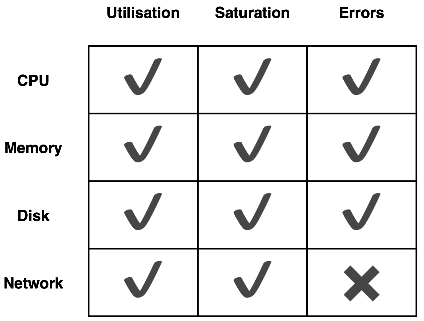 - 모든 자원에 대해, 사용률/포화도/오류를 확인