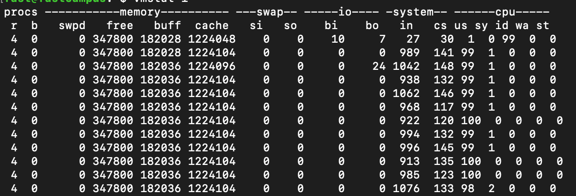. r: 실행/대기 중인 프로세스 개수, b: 인터럽트 불가능 상태의 프로세스 개수