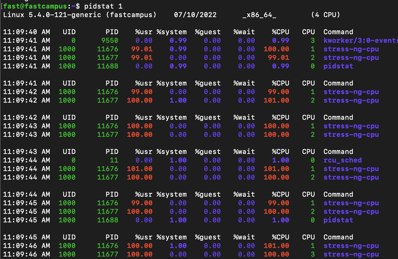 - pidstat : 프로세스/스레드별로 CPU 사용을 구분해 표시