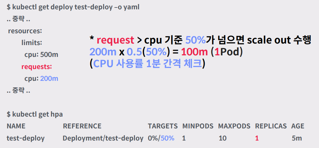 Threshold가 50%이고 requests가 200m라면 200m * 0.5(50%)로 100m라서 pod가 1개만 실행된다.