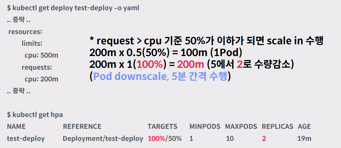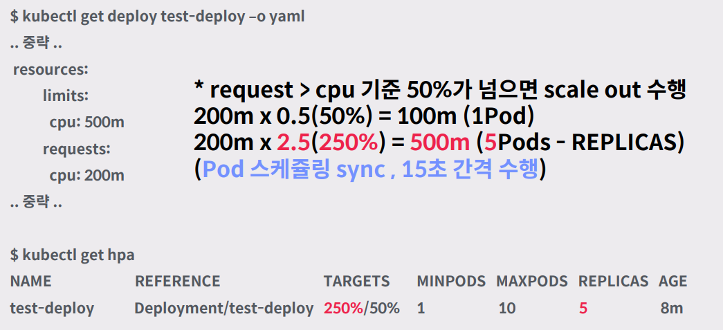 만약 cpu 사용률이 250%라면 200m * 2.5(250%)로 500m 라서 pod 5개가 실행된다.