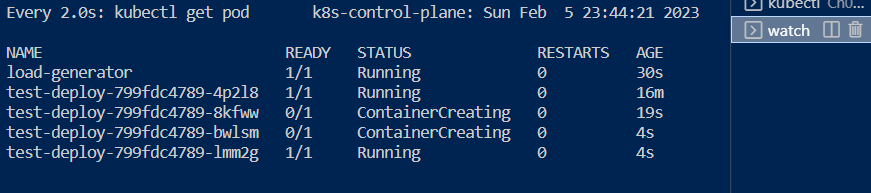 kubectl run -i --tty load-generator --rm --image=busybox --restart=Never -- /bin/sh -c "while sleep 0.01; do wget -q -O- http://test-deploy; done" 명령어로 부하를 건다.