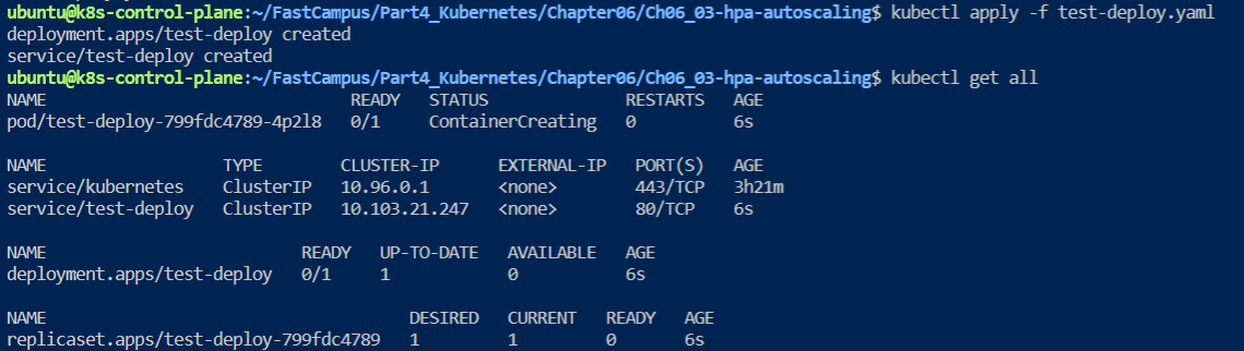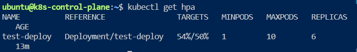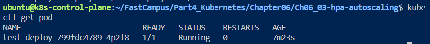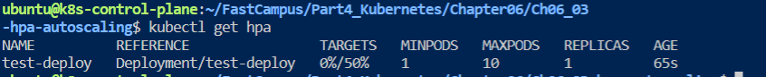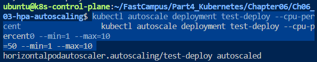 kubectl autoscale deployment test-deploy --cpu-percent=50 --min=1 --max=10로 HPA를 적용시킨다.