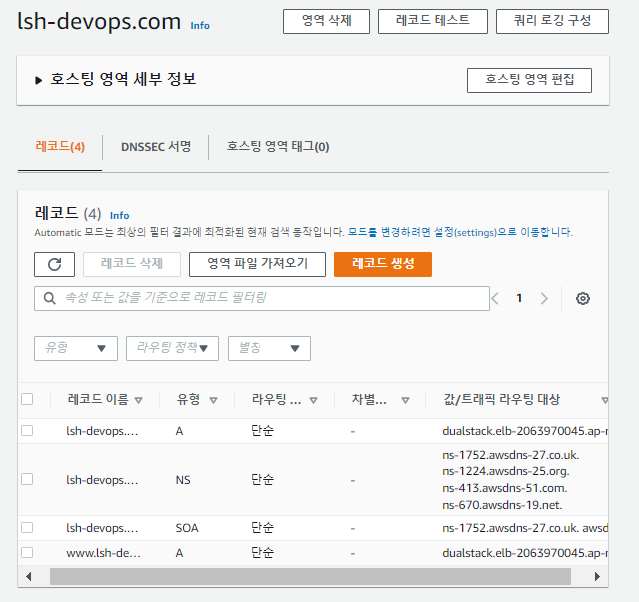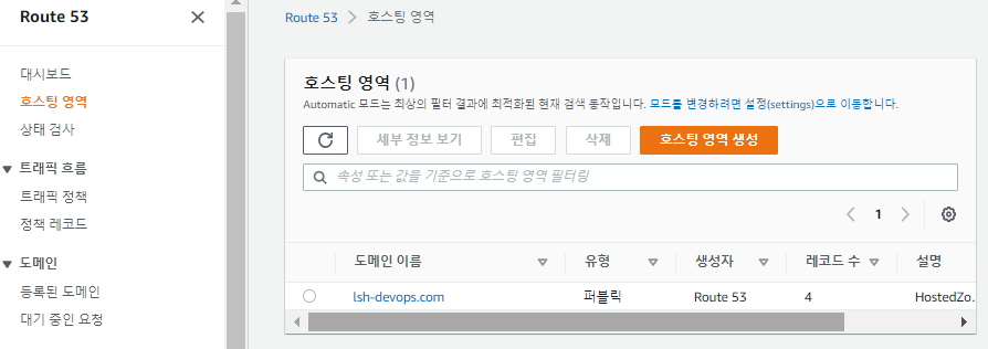 1. Route53의 호스팅 영역 메뉴로 들어가서 등록된 도메인을 클릭해보자
