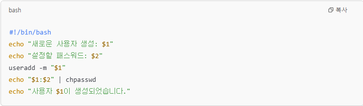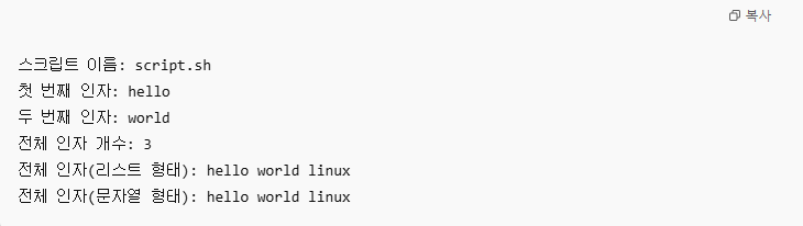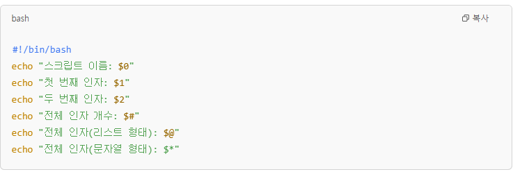 - ν¬μ§μ λ νλΌλ―Έν° ($1, $2, $#, $@) λ±μ νμ©νλ©΄ μ μ€ν¬λ¦½νΈκ° λ λμ μΌλ‘ λμν μ μμ.