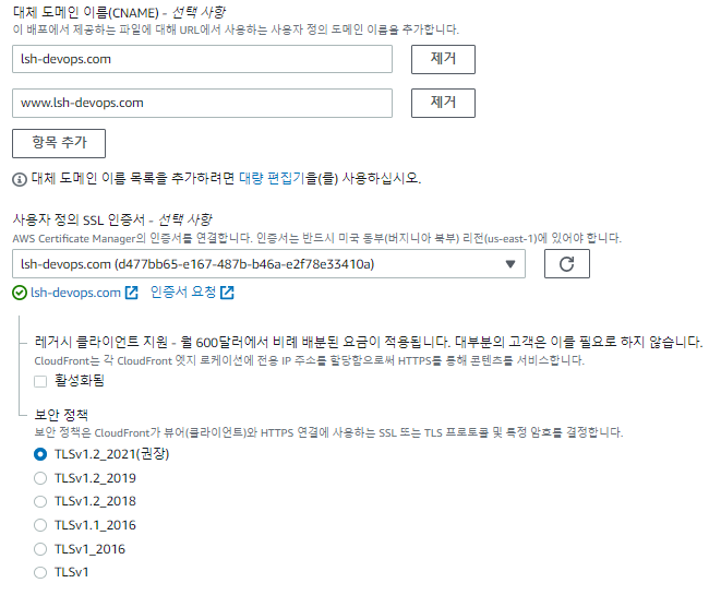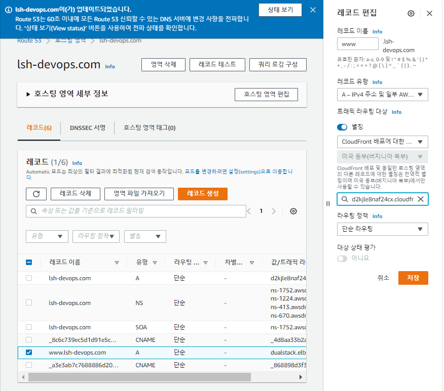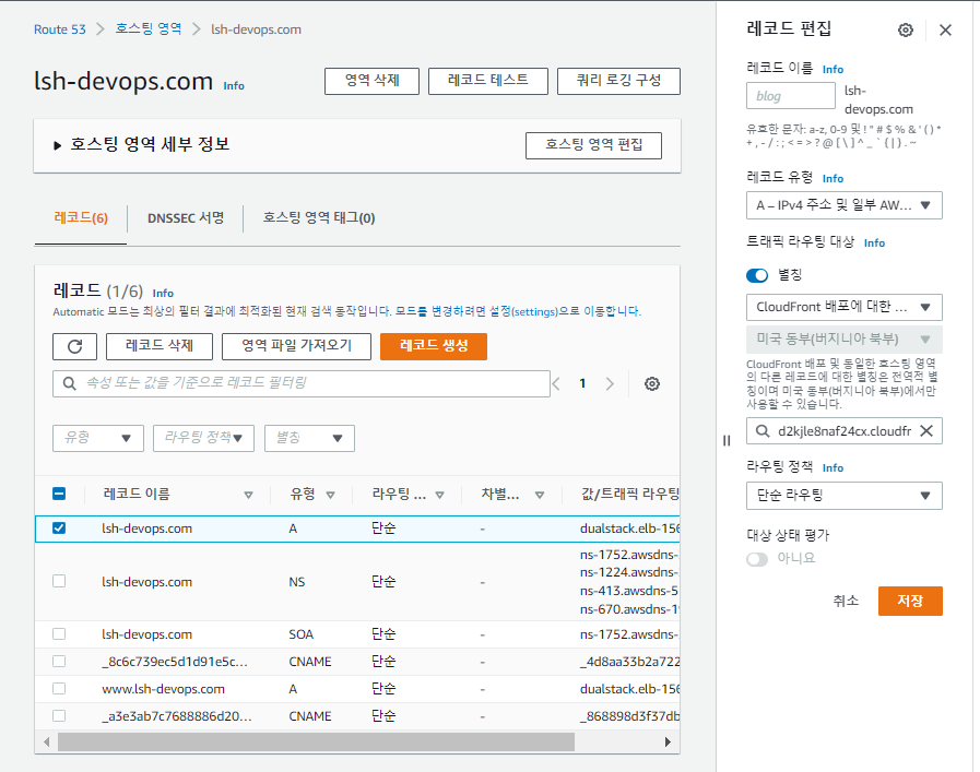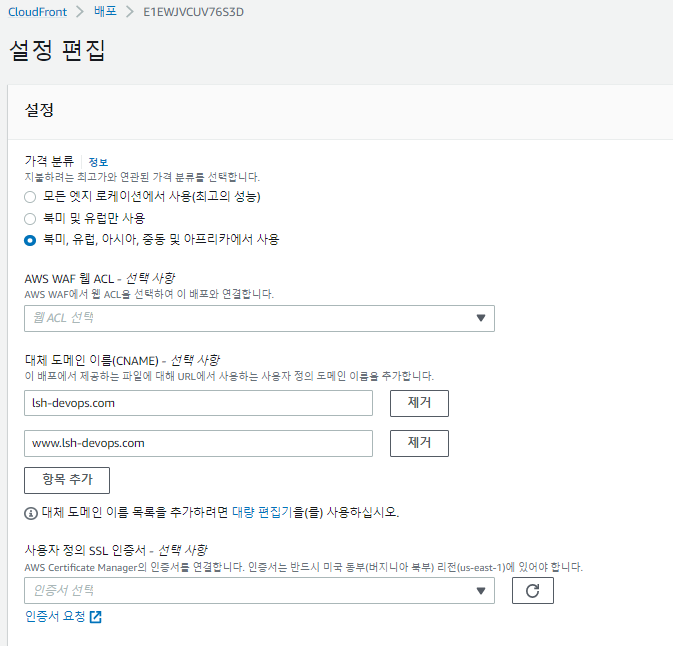그리고 설정 편집을 들어가 대체 도메인 이름(CNAME)에 lsh-devops.com와 www.lsh-devops.com을 추가하자