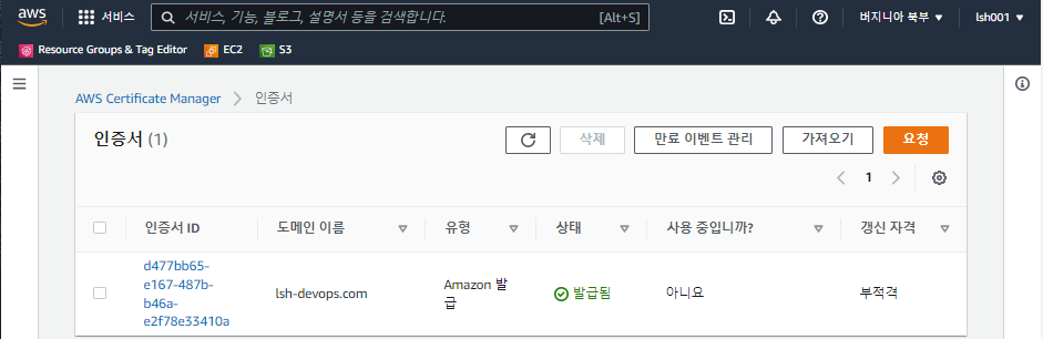 또한 미국 동부지역의 SSL인증서를 요청해서 받은 후 인증서를 선택하자