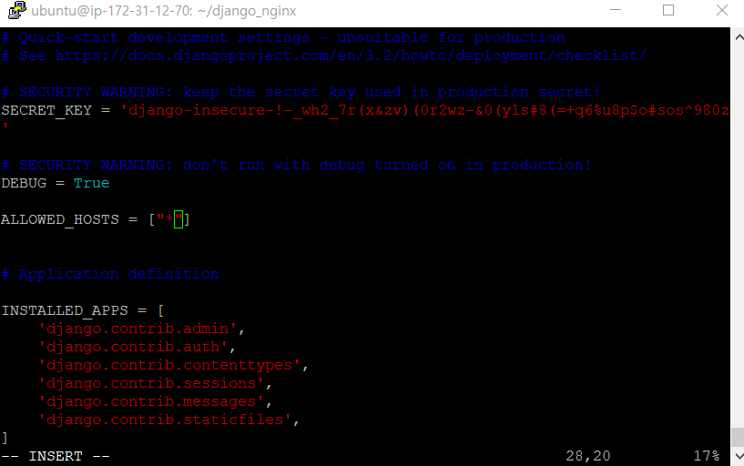 vi dango_nginx/settings.py까지 왔다면 insert모드로 들어가 ALLOWED_HOSTS를 아래와 같이 수정한다.
