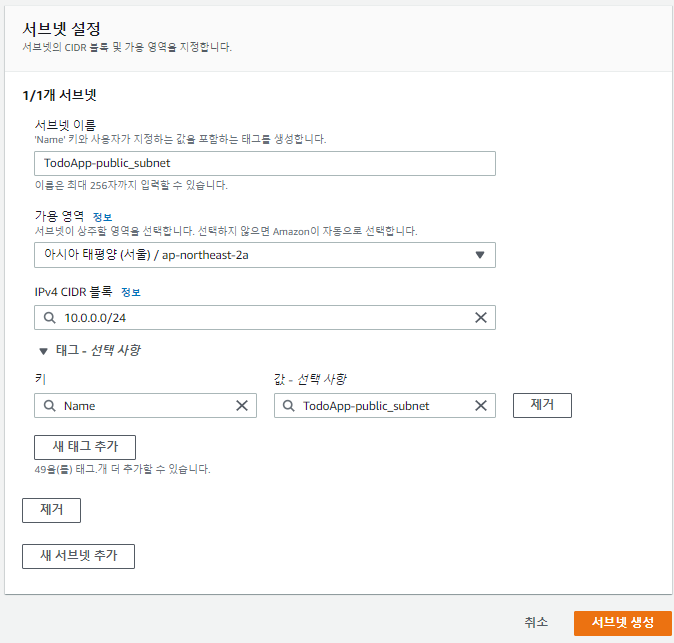 가용 영역은 ap-northeast-2a로 설정했고 IPv4 CIDR 블록은 10.0.0.0/16에 속해있는 10.0.0.0/24로 설정했다.