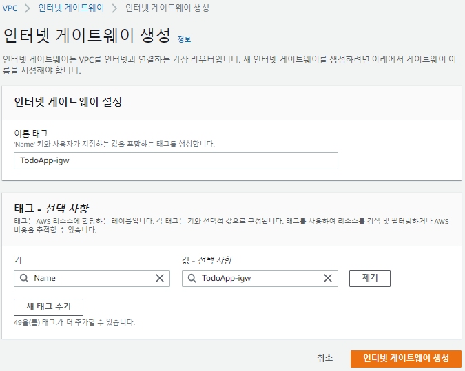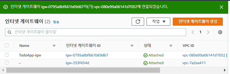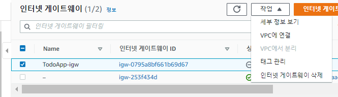 Name에 "-"로 표시된 인터넷 게이트웨이는 default VPC와 연결되어있고