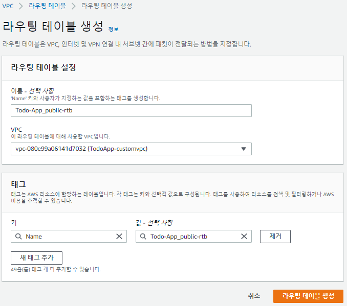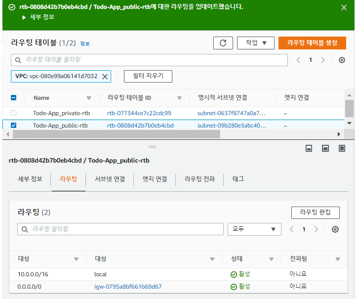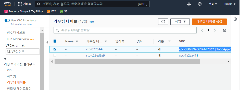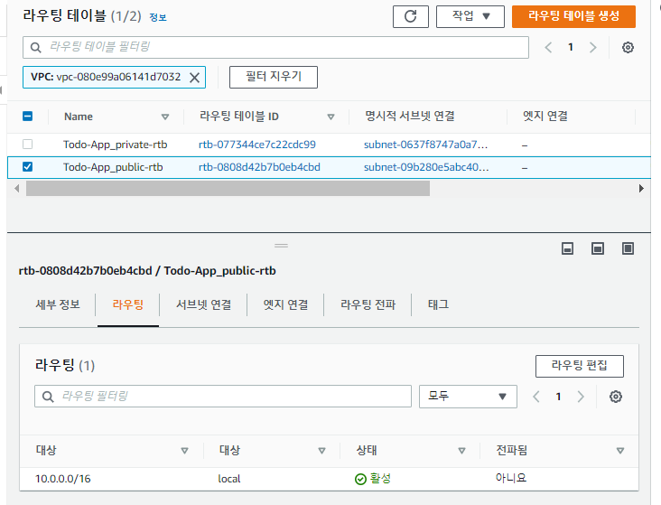 새로 만드는 라우팅 테이블은 public으로 사용하고 기본적으로 생성된 건 private으로 사용할 것이다.