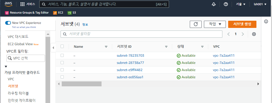 서브넷 관리콘솔에 보이는 현재 서브넷들은 default VPC에 대한 서브넷들이다.