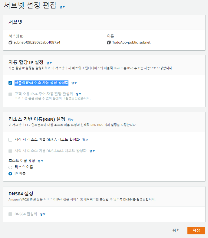 서브넷에서 새 EC2인스턴스를 생성할 때 자동으로 퍼블릭 IP주소를 할당하기 위해서는 서브넷 설정 편집에서 자동 할당 IP 설정을 체크해줘야한다.
