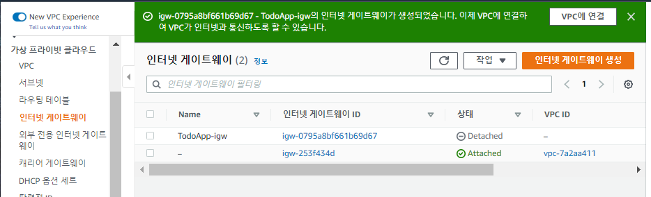 새로 만든 것은 아직 VPC와 Detached 상태이다. 따라서 작업에 VPC에 연결을 선택하자