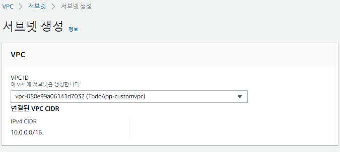 서브넷 생성에 들어가면 방금 전에 만든 VPC를 선택하자