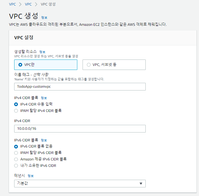IPv4 CIDR 블록은 10.0.0.0/16으로 설정하였고