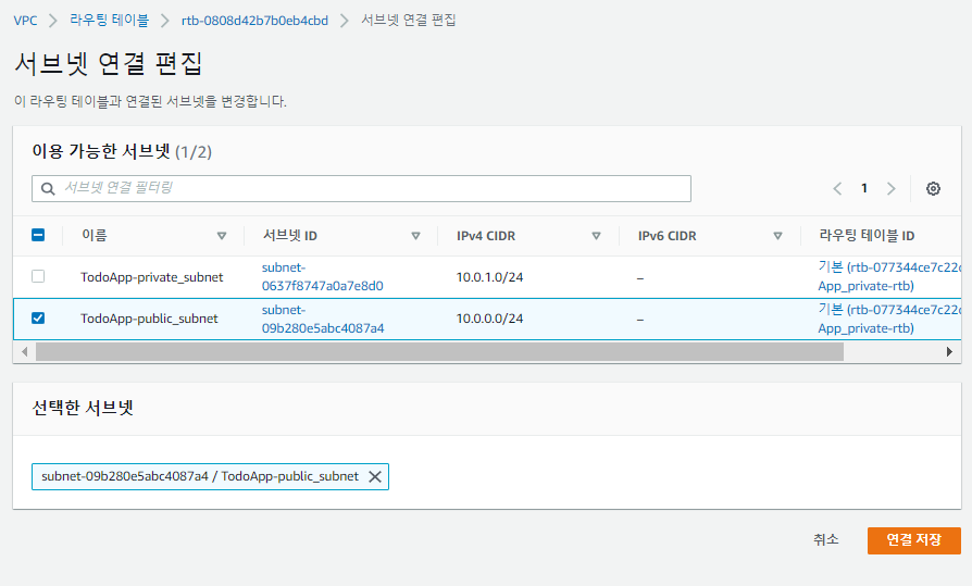 이 라우팅 테이블은 public용 이므로 public subnet과의 연결을 선택한다.