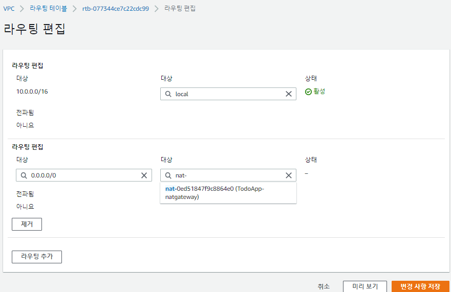 또한 private subnet의 라우팅 테이블을 수정해야 한다.