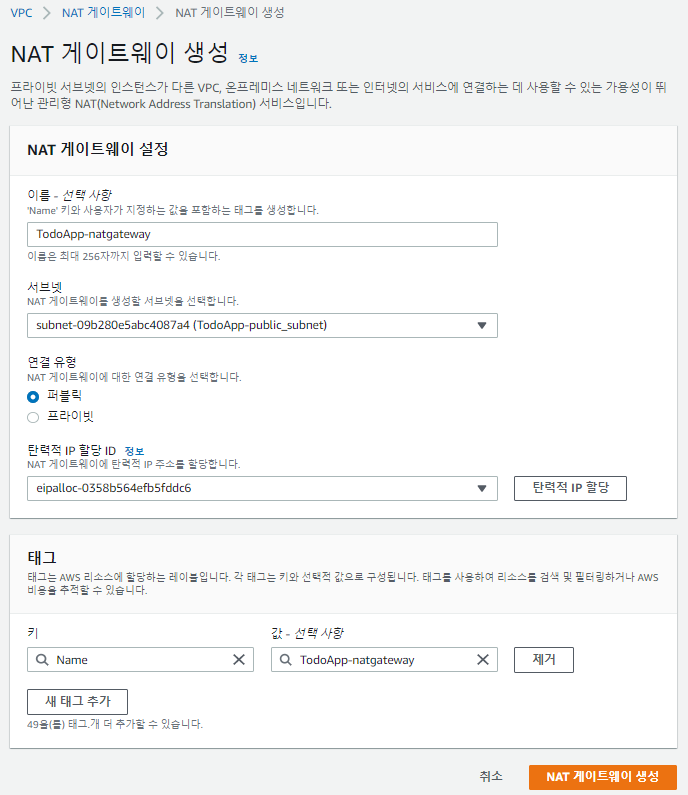 따라서 private subnet과 접속하기위해 public subnet에 NAT 게이트웨이를 생성해서 접속해보자