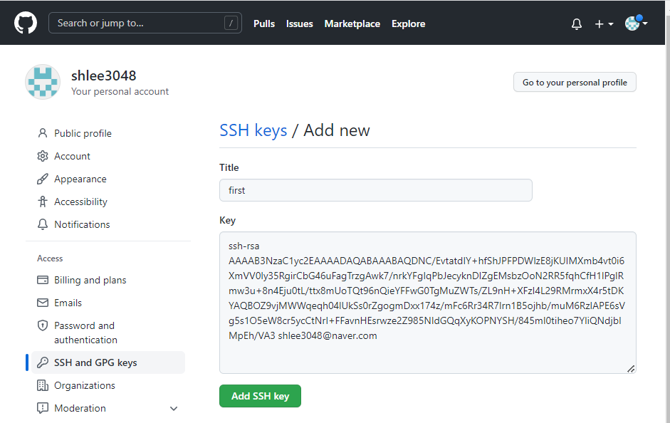 그런 후 cat ~/.ssh/id_rsa.pub 명령어를 입력해서 출력된 ssh-rsa값을 또 복사한 후 github의 계정 Settings로 들어간다.