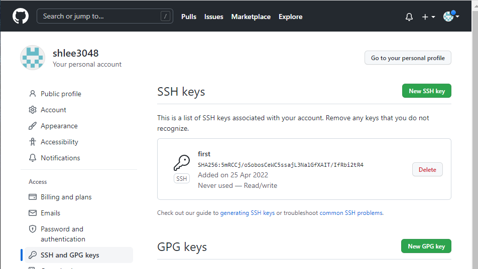 그런 다음 SSH keys 메뉴로 들어가서 키를 생성하자