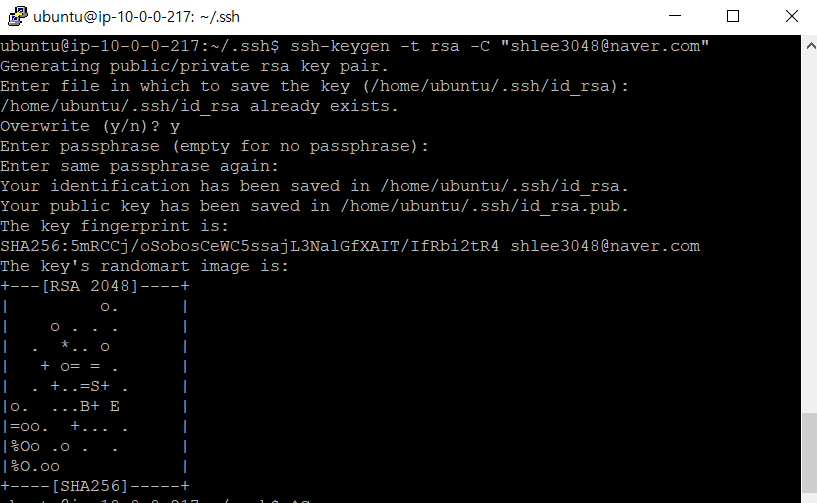 다시 ec2 인스턴스로 가서 ssh-keygen -t rsa -C "shlee3048@naver.com" 명령어를 입력한 후 엔터를 한번 치고