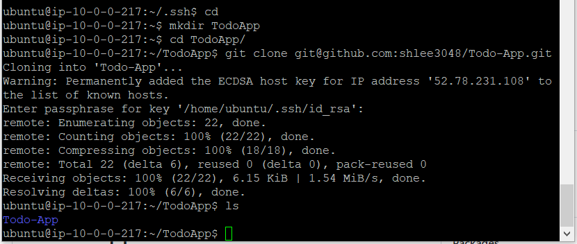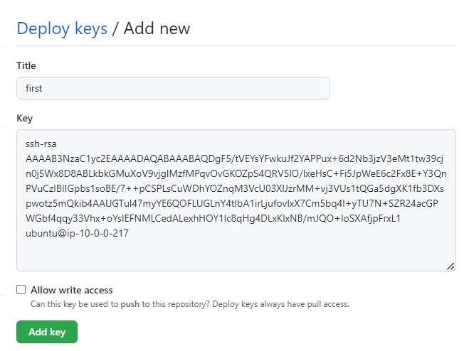 cat 명령어로 deploy key값을 볼 수 있다. 위 값을 복사해서 github에서 deploy key 값에 붙여넣는다.