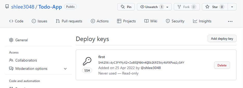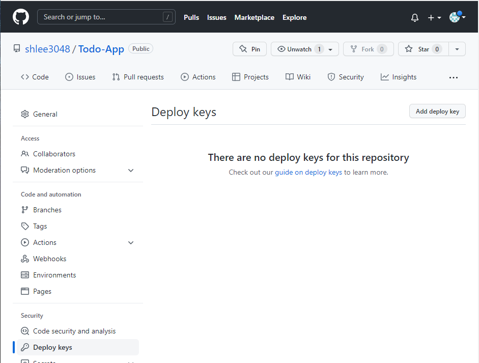 Security 메뉴에 Deploy keys를 추가해야 한다.