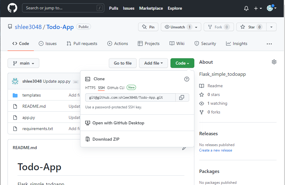 이제 프로젝트가 담긴 레포지토리로 돌아가 git clone을 하기 위한 코드를 복사하자