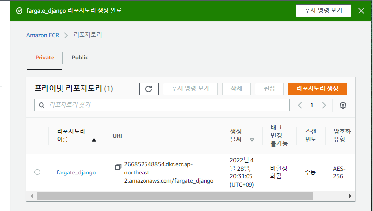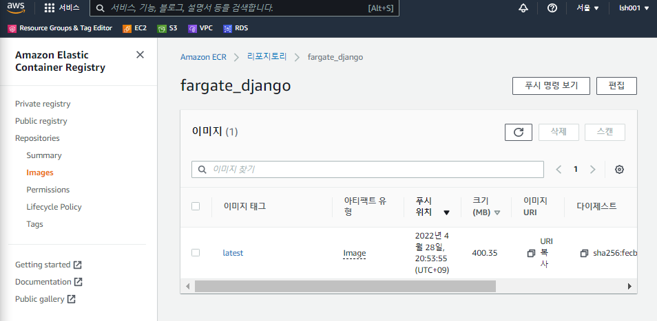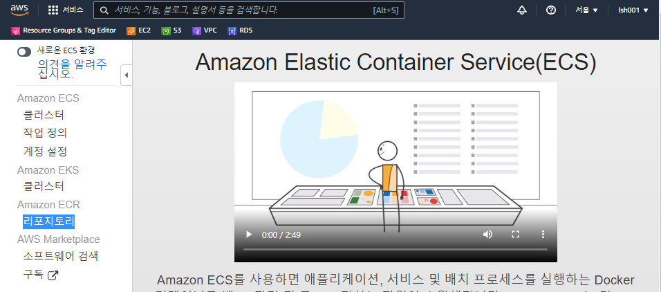다시 aws로 넘어와서 ecs를 검색하면 ECR 리포지토리가 나온다. 클릭하자