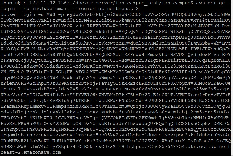 그후 aws ecr get-login --no-include-email --region ap-northeast-2 명령어를 입력하면 긴 명령어가 나오는데 그대로 복붙한다.