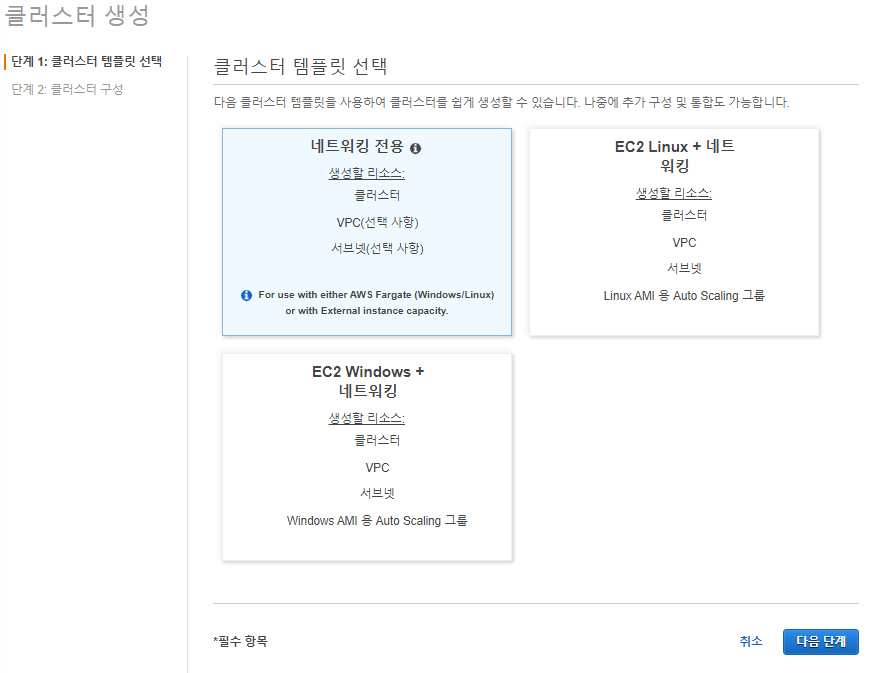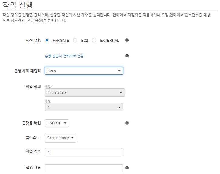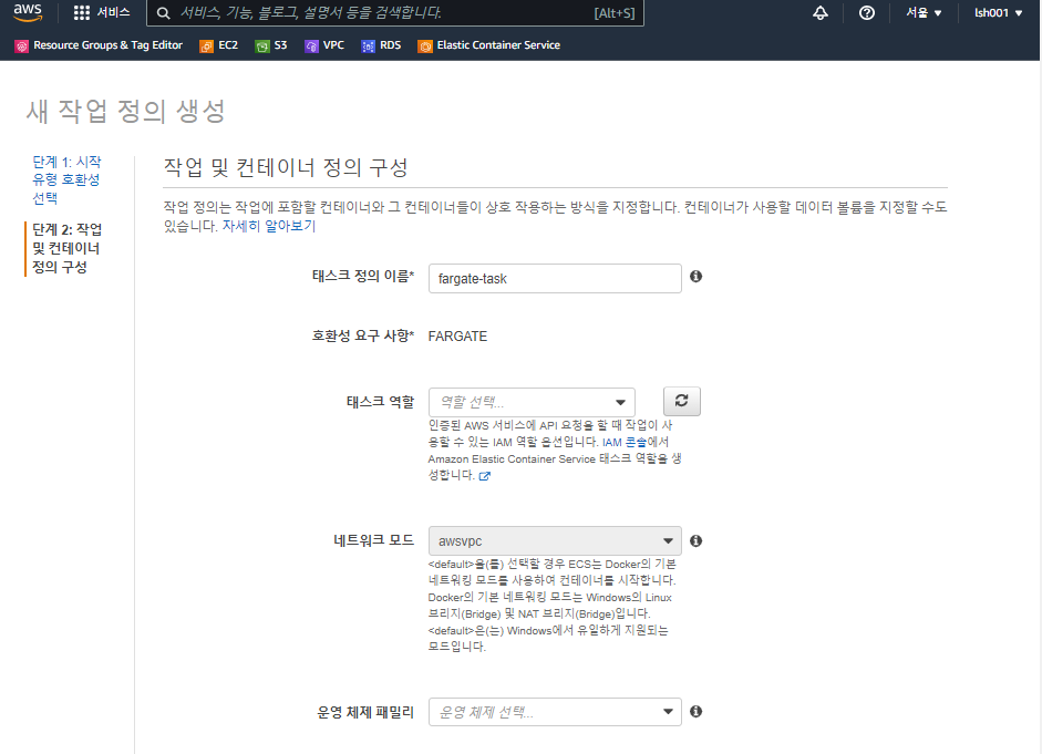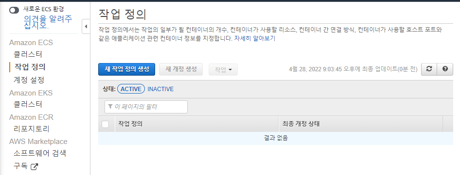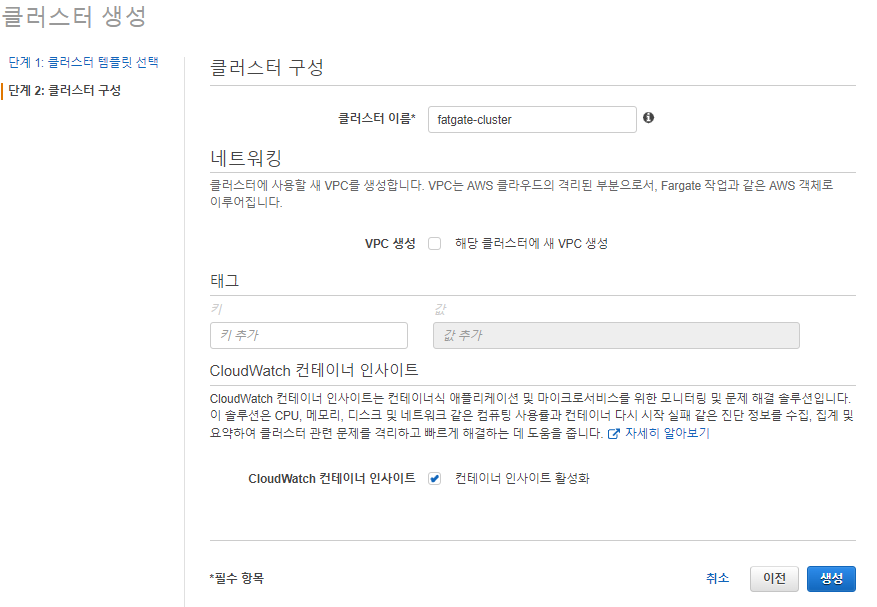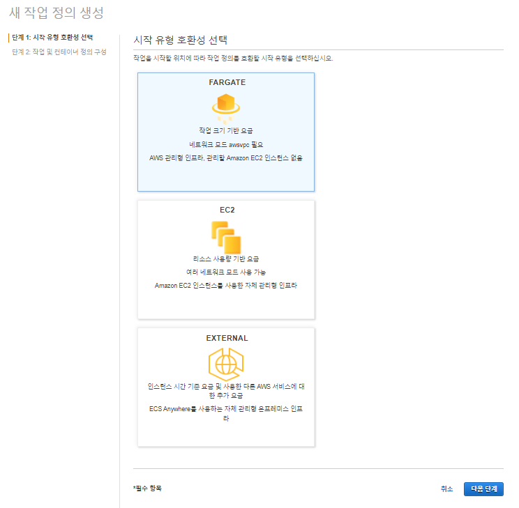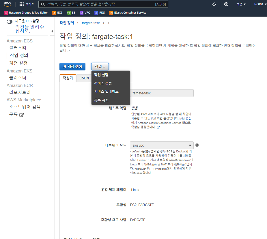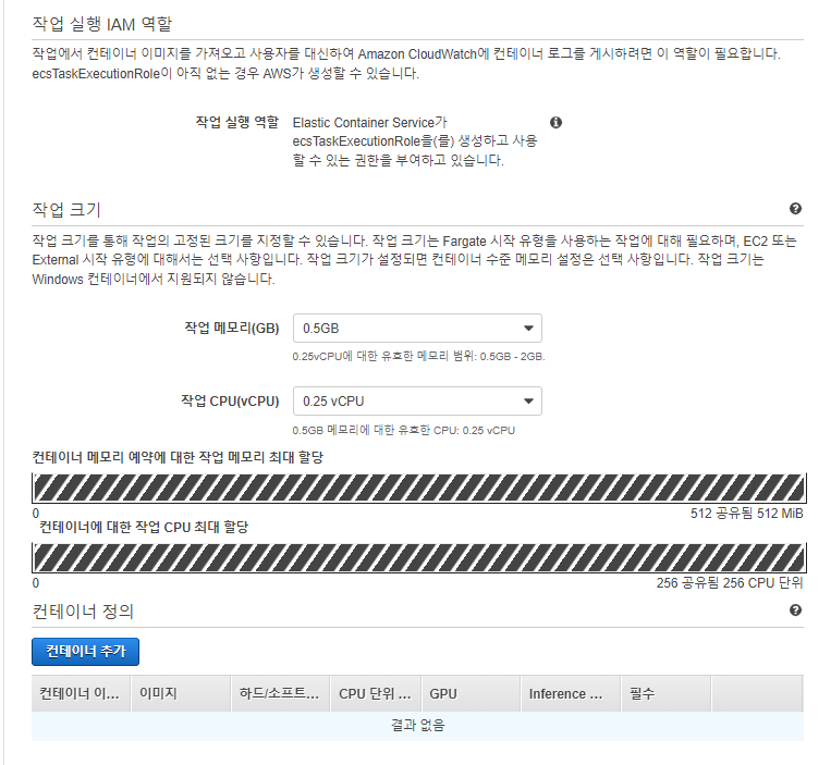 그리고 컨테이너를 추가했으면 새 작업 정의의 나머지 설정은 건들이지 않고 바로 생성을 누른다.